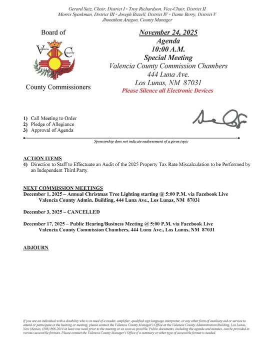 Because people showed up, spoke out, and refused to let this property tax crisis be brushed aside, the Valencia County Commission has now called a special meeting this Monday to direct staff to move forward with an independent audit of what happened.