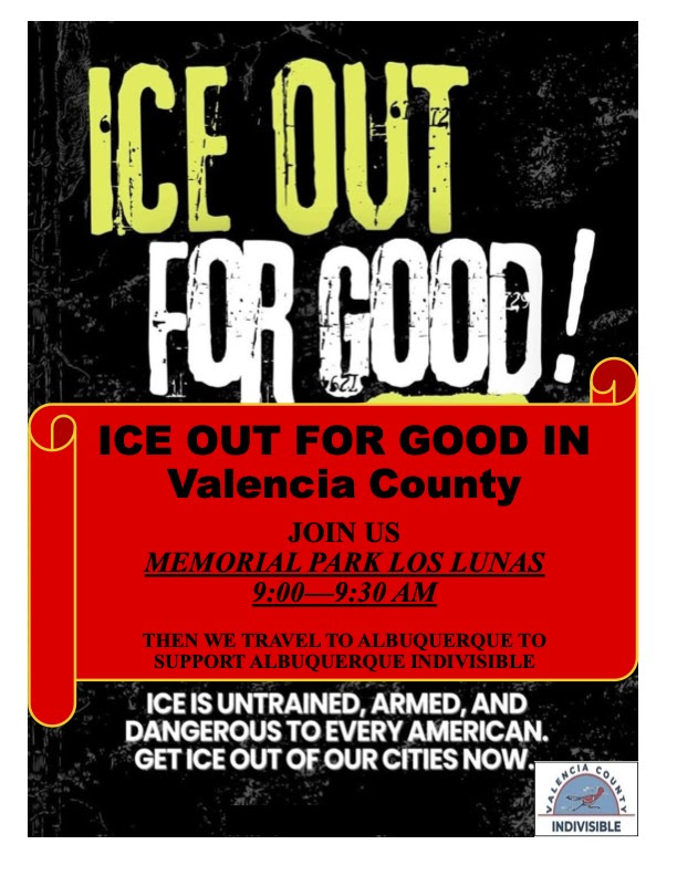 A broad coalition of groups across the country is calling for a coordinated Ice Out For Good Weekend of Action. Here in Valencia County, we will be gathering on Saturday, January 10th between 9:00 AM and 10:00 AM at Main Street Memorial Park in Los Lunas.