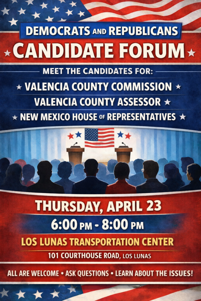 | Mark your calendars! The 2026 Candidates Forum is happening Thursday, April 23, 2026, from 6:00 PM to 8:00 PM at the Los Lunas Transportation Center. Come hear from candidates running for Valencia County Commissioner Districts 1 and 3, State Representative, and County Assessor. Presented by the Valencia County News-Bulletin, this forum is a great chance to learn where the candidates stand on the issues and stay informed before Election Day. Your voice matters, and informed voters make strong communities. We hope to see you there! |