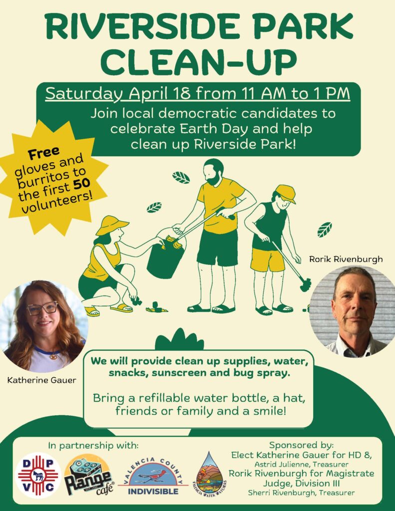 Join local candidates for an Earth Day Celebration and Clean up at Riverside Park – 1601 E. Main Street, Los Lunas, NM, 87031 – from 11 AM to 1 PM on Saturday, April 18, 2026.